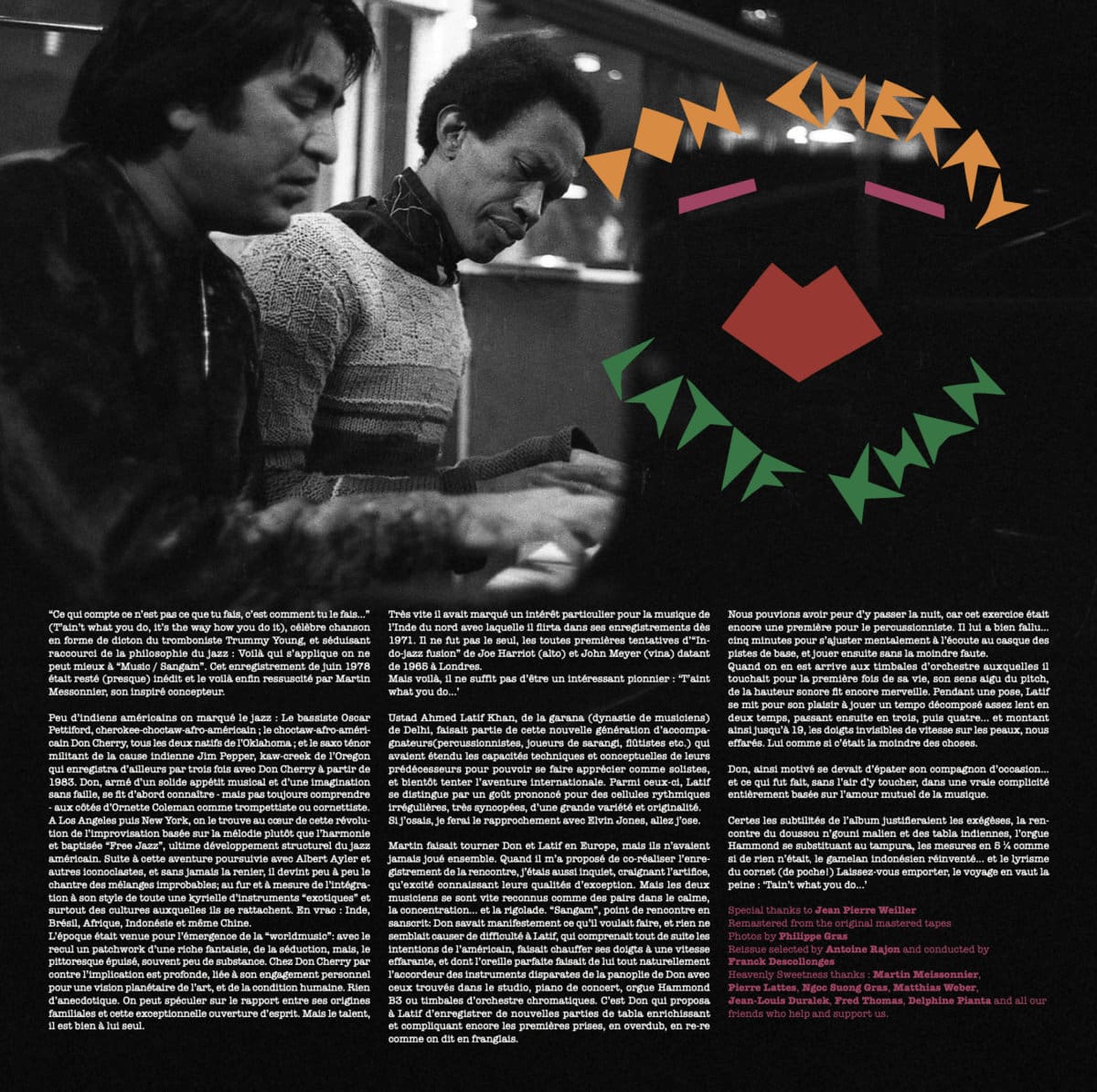 Don et Larif ne s’étaient jamais rencontrés avec l’enregistrement mais les deux musiciens se sont vite reconnus comme des pairs dans le calme, la concentration... et la rigolade. Don savait manifestement ce qu'il voulait faire, et rien ne semblait causer de difficulté à Latif, qui comprenait tout de suite les intentions de l'américain, faisait chauffer ses doigts à une vitesse effarante, et dont l'oreille parfaite faisait de lui tout naturellement l'accordeur des instruments disparates de la panoplie de Don avec ceux trouvés dans le studio, piano de concert, orgue Hammond B3 ou timbales d'orchestre chromatiques.